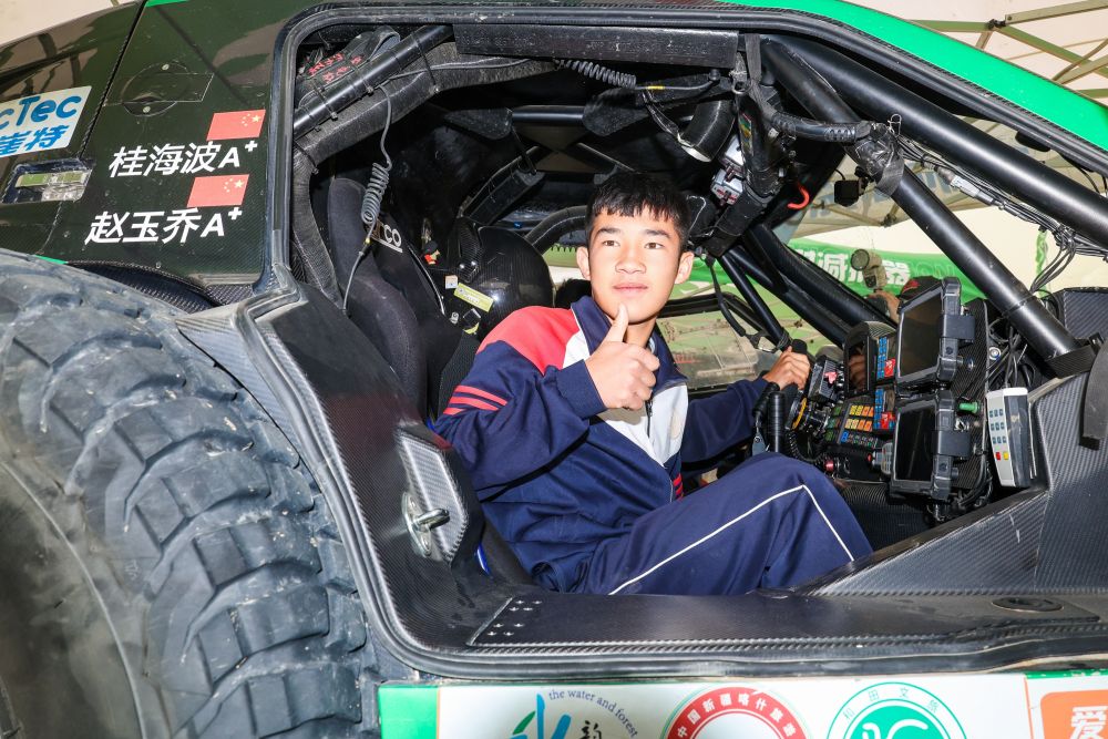 2025年5月31日,新疆喀什地區(qū)麥蓋提縣的中學(xué)生在環(huán)塔營(yíng)地參觀時(shí)與賽車合影。新華社發(fā)(環(huán)塔組委會(huì)供圖)