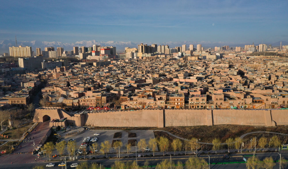 清晨,灑滿陽(yáng)光的喀什古城(2023年3月10日,無(wú)人機(jī)拍攝)。新華社記者 李響 攝