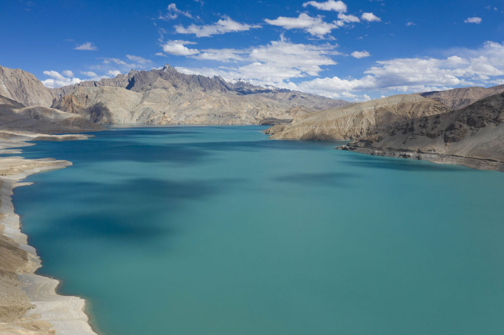 位于新疆塔什庫(kù)爾干塔吉克自治縣的“班迪爾藍(lán)湖”一角(2023年8月28日攝,無(wú)人機(jī)照片)。新華社記者 胡虎虎 攝