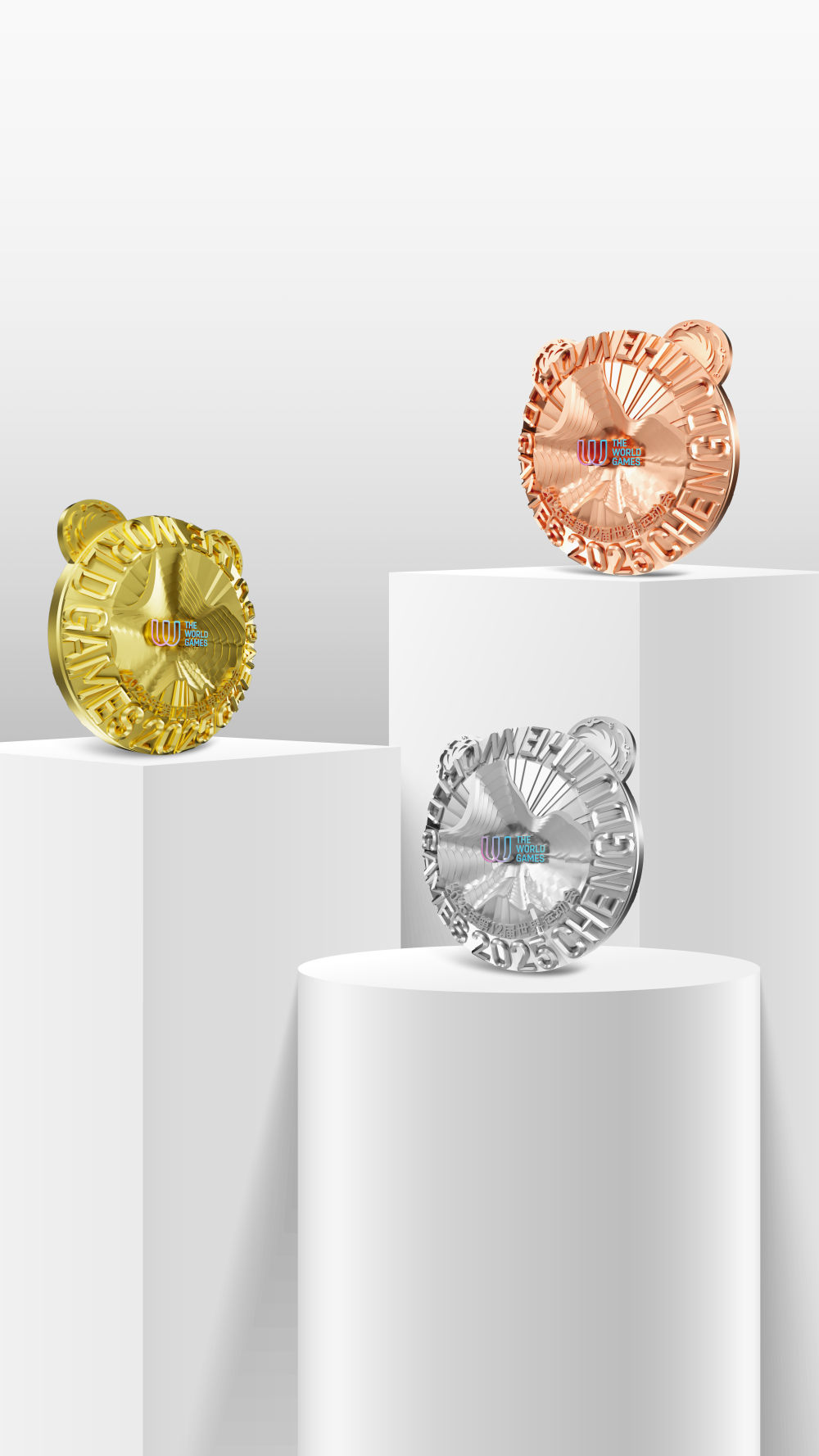 “竹光”獎(jiǎng)牌正面居中的是國(guó)際世界運(yùn)動(dòng)會(huì)協(xié)會(huì)會(huì)徽,賽事中英文名稱(chēng)環(huán)繞呼應(yīng)。巧妙融入的太陽(yáng)神鳥(niǎo)紋飾,與暗合城市輪廓的流動(dòng)凹凸線(xiàn)條,在底部營(yíng)造出層層光芒,既彰顯中華文明、巴蜀文化的璀璨歷史,更象征著運(yùn)動(dòng)精神永恒閃耀。