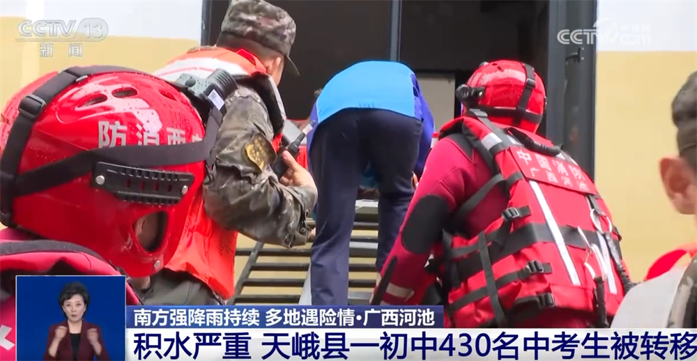 記者在現(xiàn)場(chǎng)看到,整個(gè)天峨縣民族中學(xué)依然被大水圍困,在一棟住宿樓里住著初三的學(xué)生,本來(lái)按照計(jì)劃,整個(gè)中學(xué)是一個(gè)初中升高中的考點(diǎn),這些學(xué)生24日要參加中考。因?yàn)榇笏畤?,?dāng)?shù)刂荒芘R時(shí)改變計(jì)劃。為了保證考試正常進(jìn)行,學(xué)校向當(dāng)?shù)亟逃趾拖嚓P(guān)部門申請(qǐng)了救援,記者在現(xiàn)場(chǎng)看到,目前是天峨縣應(yīng)急管理局綜合救援大隊(duì)以及武警河池支隊(duì)的救援隊(duì)員來(lái)到了現(xiàn)場(chǎng),通過(guò)搭建云梯的方式將學(xué)生和行李一步一步運(yùn)送出來(lái)。