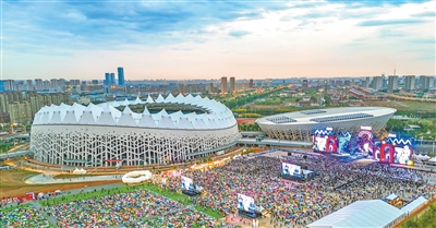 安徽省蕪湖市峨山鎮(zhèn)的繁昌人民體育公園內(nèi),人們?cè)谟^看音樂(lè)節(jié)表演。
