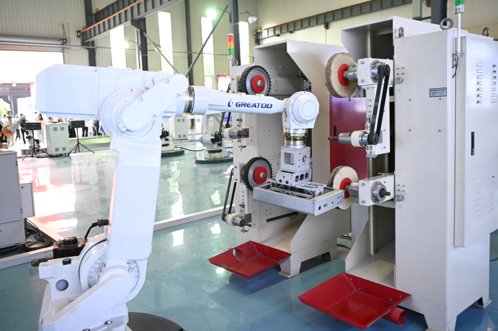 位于揭陽(yáng)的巨輪智能裝備股份有限公司的光伏控制箱機(jī)器人打磨單元(6月29日攝)。新華社記者鄧華攝