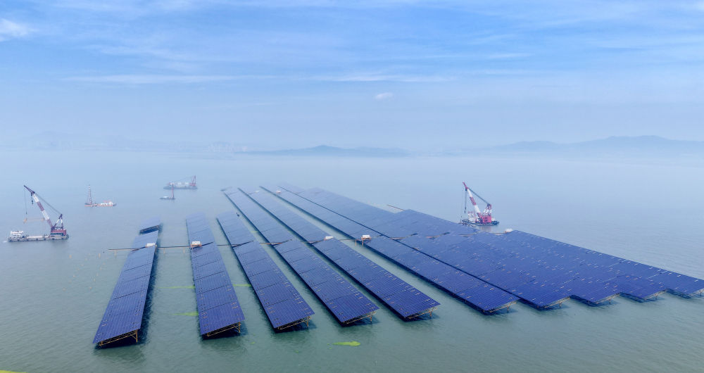 青島市即墨區(qū)鰲山灣海域的海上光伏項(xiàng)目區(qū)(7月3日攝,無(wú)人機(jī)照片)。新華社記者李紫恒攝