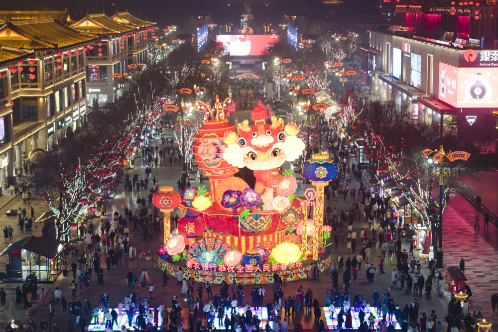 市民游客在西安大唐不夜城游玩(1月22日攝,無(wú)人機(jī)照片)。新華社記者邵瑞攝