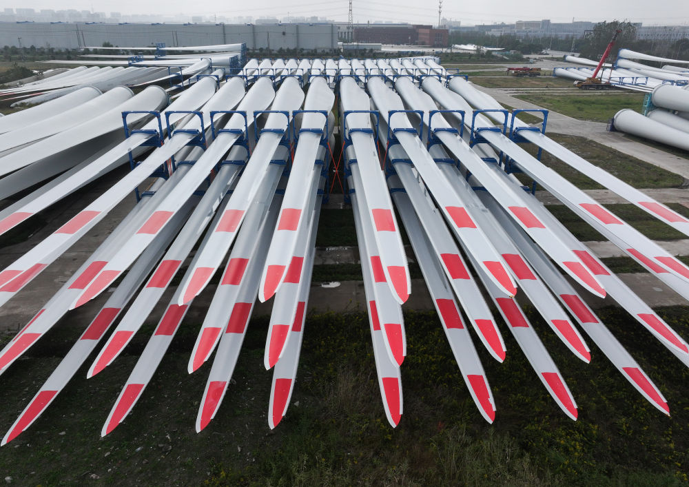 這是2024年11月2日在重通成飛風(fēng)電設(shè)備江蘇有限公司拍攝的風(fēng)力發(fā)電機(jī)組葉片(無(wú)人機(jī)照片)。新華社記者宋彥樺攝