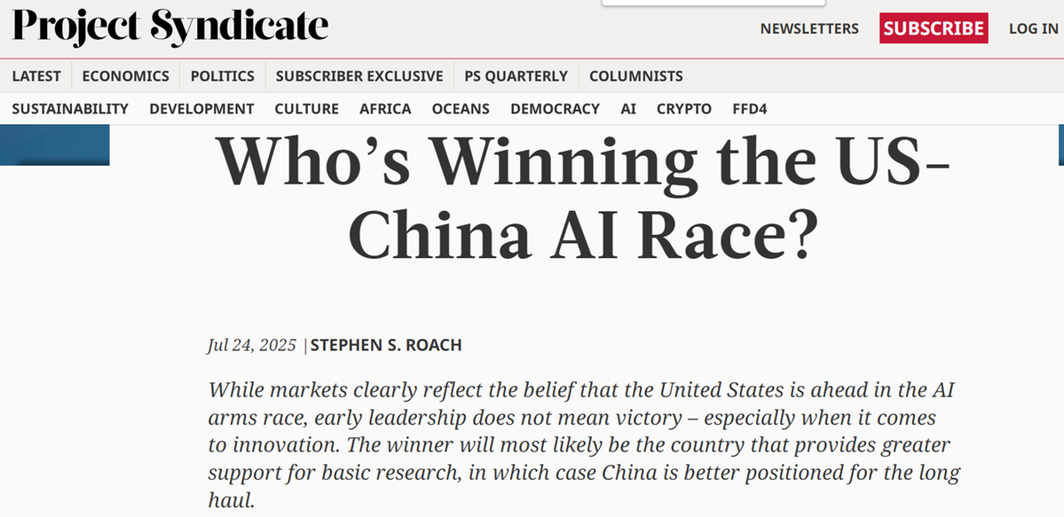 美國(guó)摩根士丹利亞洲區(qū)前主席斯蒂芬·羅奇在報(bào)業(yè)辛迪加網(wǎng)站(Project Syndicate)發(fā)表文章指出,全球人工智能(AI)競(jìng)賽的勝負(fù)取決于基礎(chǔ)研究的投入,而非短期市場(chǎng)表現(xiàn)。羅奇認(rèn)為,中國(guó)憑借產(chǎn)業(yè)生態(tài)、研發(fā)投入和文化傳統(tǒng),使其在長(zhǎng)期競(jìng)爭(zhēng)中占據(jù)優(yōu)勢(shì)。