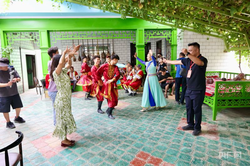 在努爾東·司馬義的院落里,藝人與游客即興共舞(央廣網(wǎng)記者 梁瑜琳 攝)