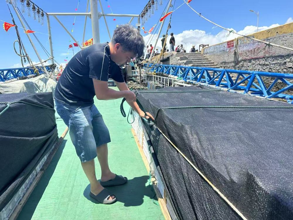8月16日上午,閩惠漁00177號(hào)船長(zhǎng)陳聰莆進(jìn)行開(kāi)漁前的最后準(zhǔn)備工作。新華社記者 龐夢(mèng)霞 攝
