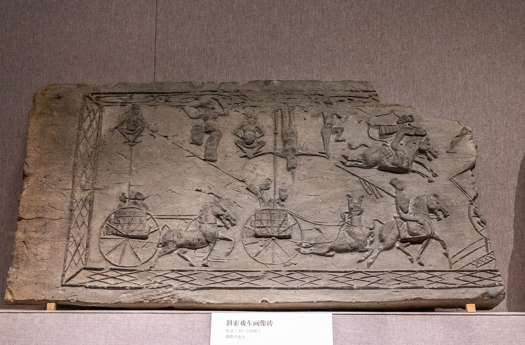 △漢代平索戲車車騎出行畫像磚 中國(guó)國(guó)家博物館藏