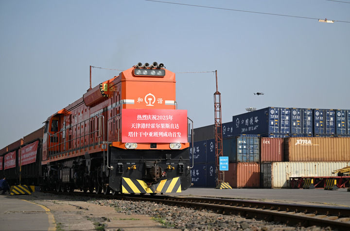 2025年首列天津港經(jīng)霍爾果斯直達(dá)塔什干的中亞班列從天津港物捷三堆場發(fā)車(2025年5月20日攝)。