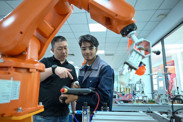 在天津現(xiàn)代職業(yè)技術(shù)學(xué)院魯班工坊實訓(xùn)教室,教師指導(dǎo)學(xué)生操作設(shè)備(2025年6月16日攝)。