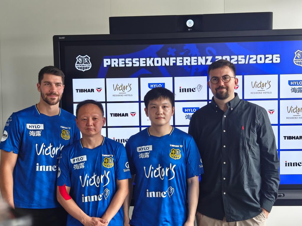 8月27日,中國乒乓球運(yùn)動(dòng)員樊振東(右二)出席德國乒乓球甲級聯(lián)賽薩爾布呂肯俱樂部的新賽季發(fā)布會(huì)。新華社記者 趙建通 攝