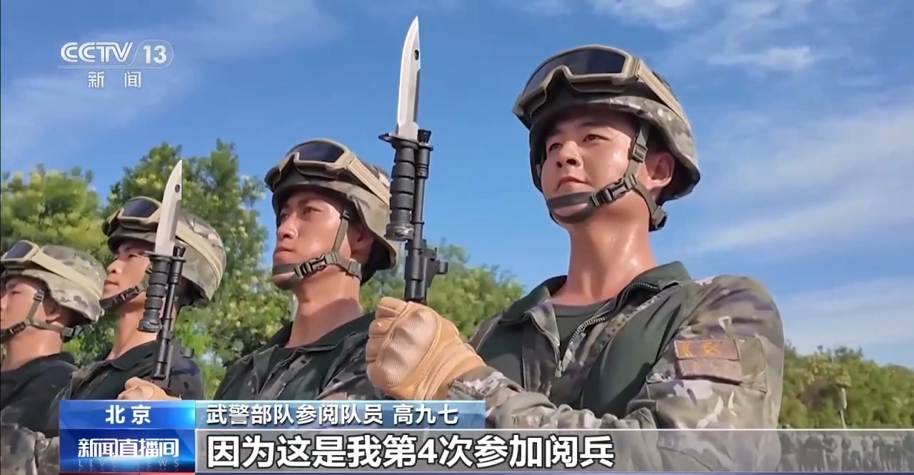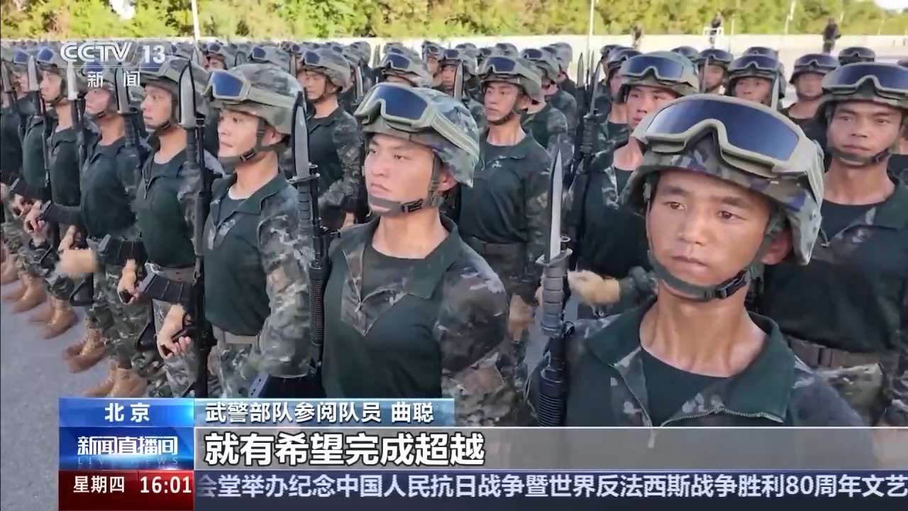 武警部隊方隊方隊長 崔曉偉:目前我們已經(jīng)進入最后的沖刺階段,在紀(jì)念抗戰(zhàn)勝利80周年紀(jì)念日當(dāng)天,以最昂揚的精神狀態(tài)、最標(biāo)準(zhǔn)規(guī)范的受閱動作,光榮地接受黨和人民檢閱,接受習(xí)主席檢閱。