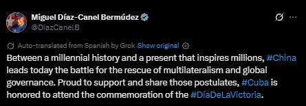 迪亞斯-卡內爾在社交媒體上發(fā)文稱,“在綿延千年的歷史與激勵億萬人的當下之間,中國今日引領捍衛(wèi)多邊主義與全球治理的斗爭。古巴為支持并踐行這些理念而自豪,并榮幸出席勝利日紀念活動?!?/p>