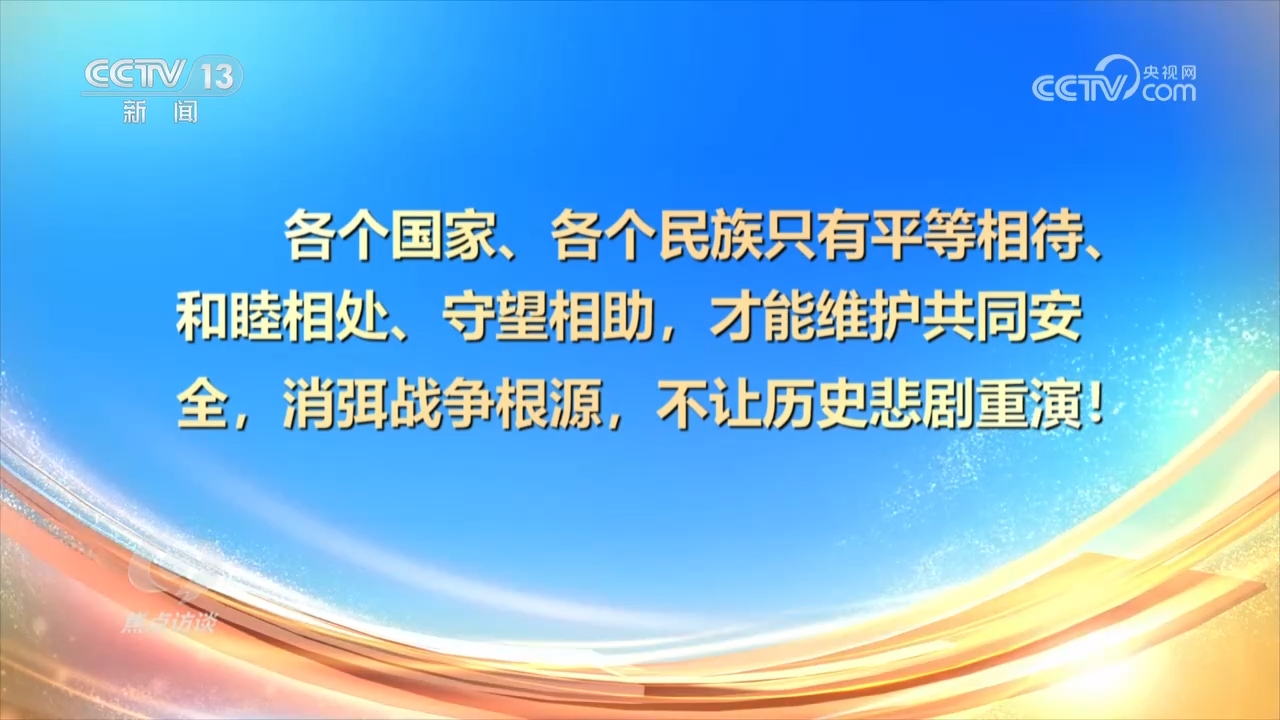 央視網(wǎng)消息(焦點訪談):9月3日上午,紀念中國人民抗日戰(zhàn)爭暨世界反法西斯戰(zhàn)爭勝利80周年大會在北京隆重舉行。我們以盛大閱兵儀式,同世界人民一道紀念這個偉大的日子。同日,紀念中國人民抗日戰(zhàn)爭暨世界反法西斯戰(zhàn)爭勝利80周年招待會在人民大會堂隆重舉行。在這些紀念活動中,習(xí)近平總書記發(fā)表一系列重要講話,強調(diào)要銘記歷史、緬懷先烈、珍愛和平、開創(chuàng)未來。