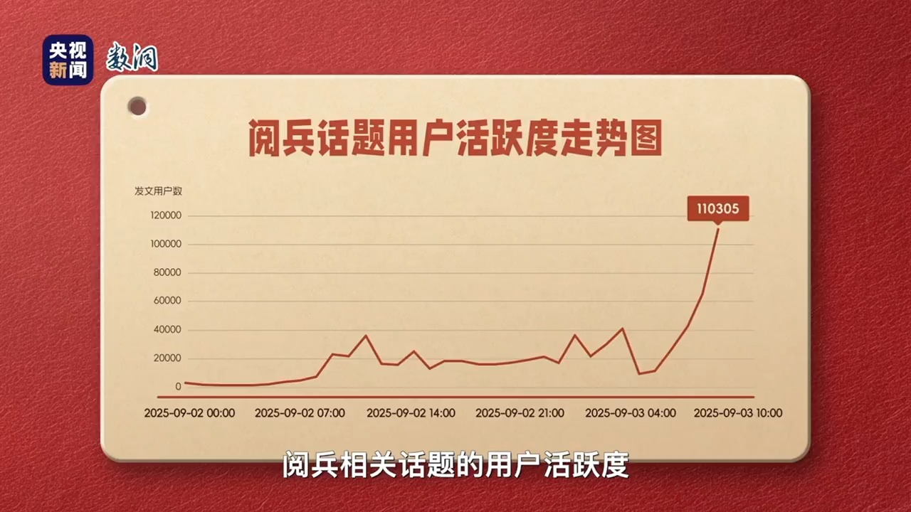 數(shù)據(jù)曲線和觀眾的情緒重疊上揚,開始的瞬間,閱兵相關(guān)話題的用戶活躍度飆升到前一天最高值的三倍。