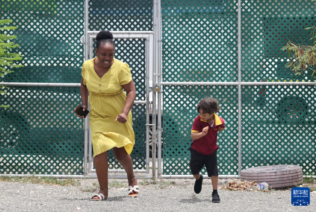 9月4日,在牙買(mǎi)加首都金斯敦艾特特殊教育小學(xué),老師陪伴學(xué)生在操場(chǎng)玩耍。新華社記者 李夢(mèng)馨 攝
