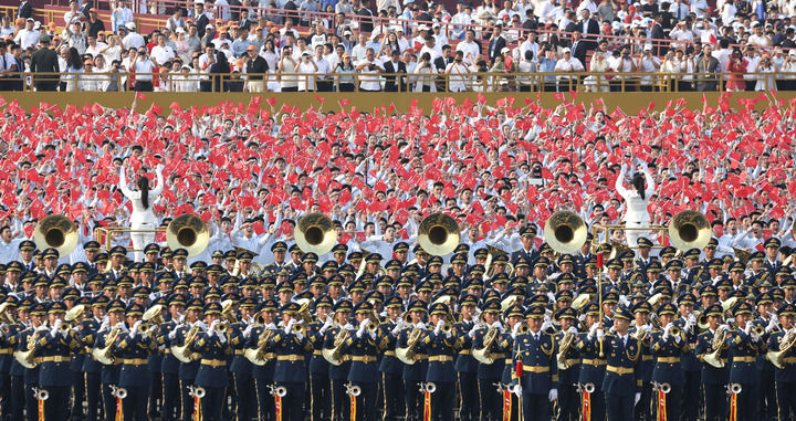 ↑9月3日,紀(jì)念中國人民抗日戰(zhàn)爭(zhēng)暨世界反法西斯戰(zhàn)爭(zhēng)勝利80周年大會(huì)在北京隆重舉行。這是中國人民解放軍聯(lián)合軍樂團(tuán)和合唱團(tuán)。新華社記者 劉衛(wèi)兵 攝