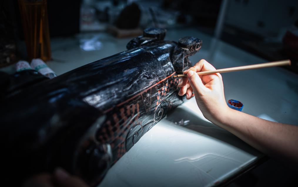 在荊州文物保護中心,文物修復(fù)人員修復(fù)一件戰(zhàn)國獸形酒具盒。新華社記者肖藝九 攝