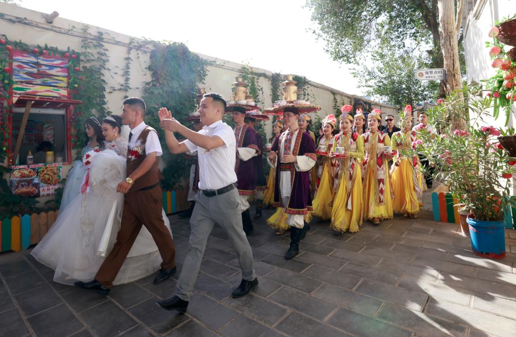 7月22日,在新疆庫(kù)車市的龜茲小巷,表演薩瑪瓦爾舞的演員參與當(dāng)?shù)氐囊粓?chǎng)婚禮活動(dòng)。新華社記者 王菲 攝