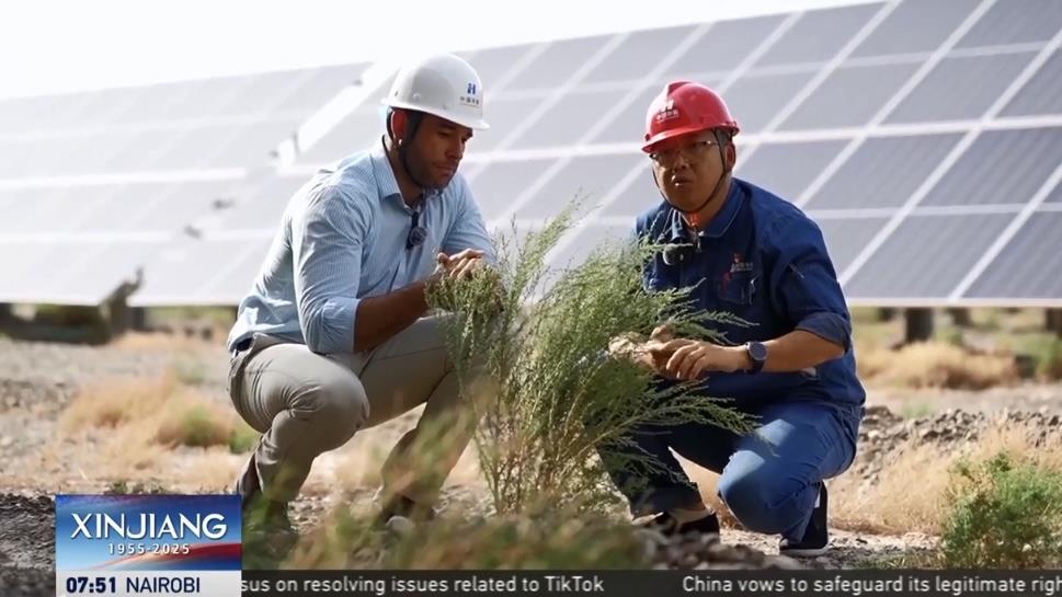 外籍主持人林肯探訪了全球最大的“草光互補(bǔ)”光伏基地——阿合雅光伏產(chǎn)業(yè)園。這片由181萬(wàn)塊光伏板組成的藍(lán)色海洋,占地493公頃,相當(dāng)于700個(gè)標(biāo)準(zhǔn)足球場(chǎng)。不僅能夠提供滿足約43萬(wàn)人全年用電需求,還兼具治沙功效。中國(guó)華能集團(tuán)烏什光伏電站負(fù)責(zé)人周博表示,這類光伏設(shè)施能夠穩(wěn)固土壤、防止侵蝕,板面凝結(jié)的水珠還可灌溉下方土地,支持植物持續(xù)生長(zhǎng)。“戈壁奇跡”的背后,是國(guó)家實(shí)現(xiàn)“雙碳”目標(biāo)而推動(dòng)的生態(tài)與能源的“雙向奔赴”。