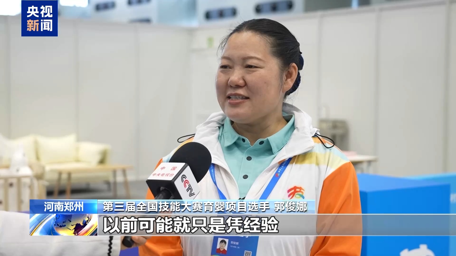 第三屆全國技能大賽育嬰項目選手 郭俊娜:比如給寶寶喂奶,以前可能只是憑經(jīng)驗,現(xiàn)在就要求抱孩子45度斜角。把流程標準化了,能夠更好地服務嬰幼兒以及家庭。