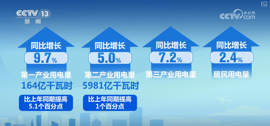 數(shù)據(jù)顯示,第一產(chǎn)業(yè)和第二產(chǎn)業(yè)用電量保持較快增長,第三產(chǎn)業(yè)和居民用電量有所回落。具體看,第一產(chǎn)業(yè)用電量164億千瓦時,同比增長9.7%,比上年同期提高5.1個百分點;第二產(chǎn)業(yè)用電量5981億千瓦時,同比增長5.0%,比上年同期提高1個百分點;第三產(chǎn)業(yè)和居民用電量分別同比增長7.2%和2.4%。