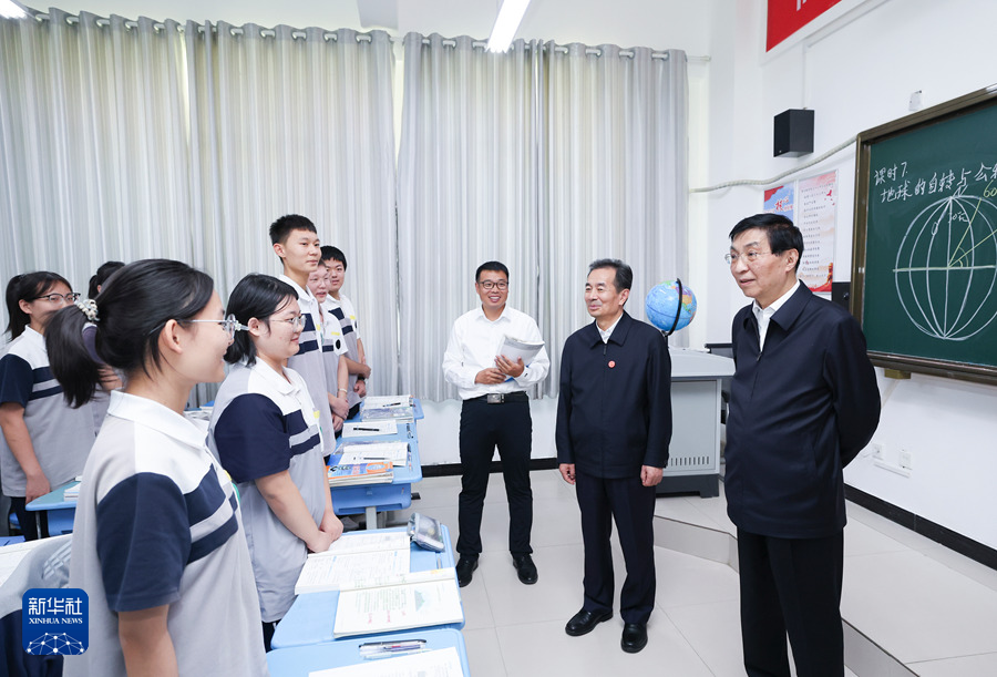 9月25日下午,受習(xí)近平總書記囑托,中共中央政治局常委、全國政協(xié)主席、中央代表團團長王滬寧帶領(lǐng)中央代表團部分成員在巴音郭楞蒙古自治州庫爾勒市看望慰問當?shù)馗髯甯刹咳罕?。這是王滬寧和中央代表團部分成員在庫爾勒市第二十三中學(xué)考察教育援疆情況。新華社記者 姚大偉 攝