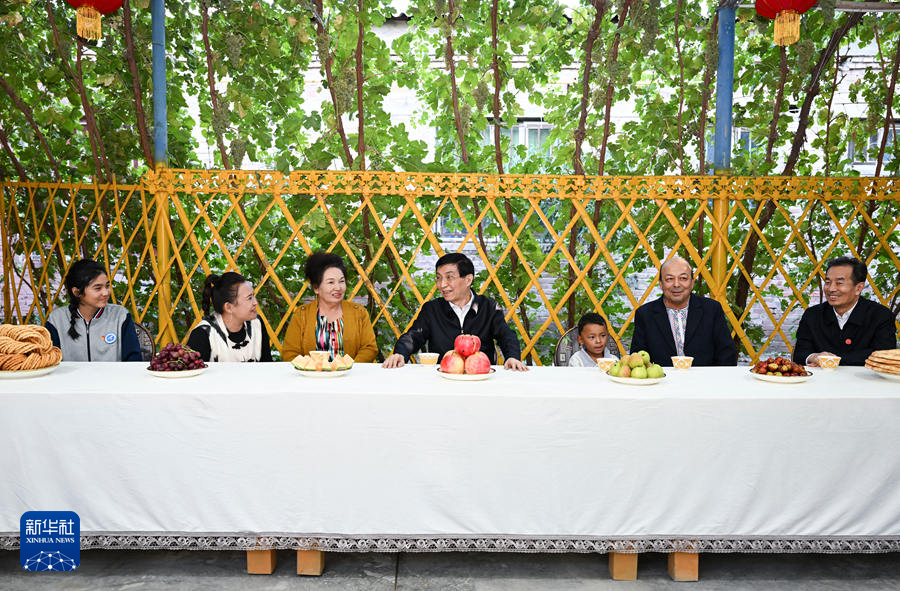 9月25日下午,受習(xí)近平總書記囑托,中共中央政治局常委、全國政協(xié)主席、中央代表團團長王滬寧帶領(lǐng)中央代表團部分成員在巴音郭楞蒙古自治州庫爾勒市看望慰問當?shù)馗髯甯刹咳罕姟_@是王滬寧和中央代表團部分成員在庫爾勒市阿瓦提鄉(xiāng)吾夏克鐵熱克村了解鄉(xiāng)村產(chǎn)業(yè)發(fā)展和群眾生產(chǎn)生活情況。新華社記者 張領(lǐng) 攝