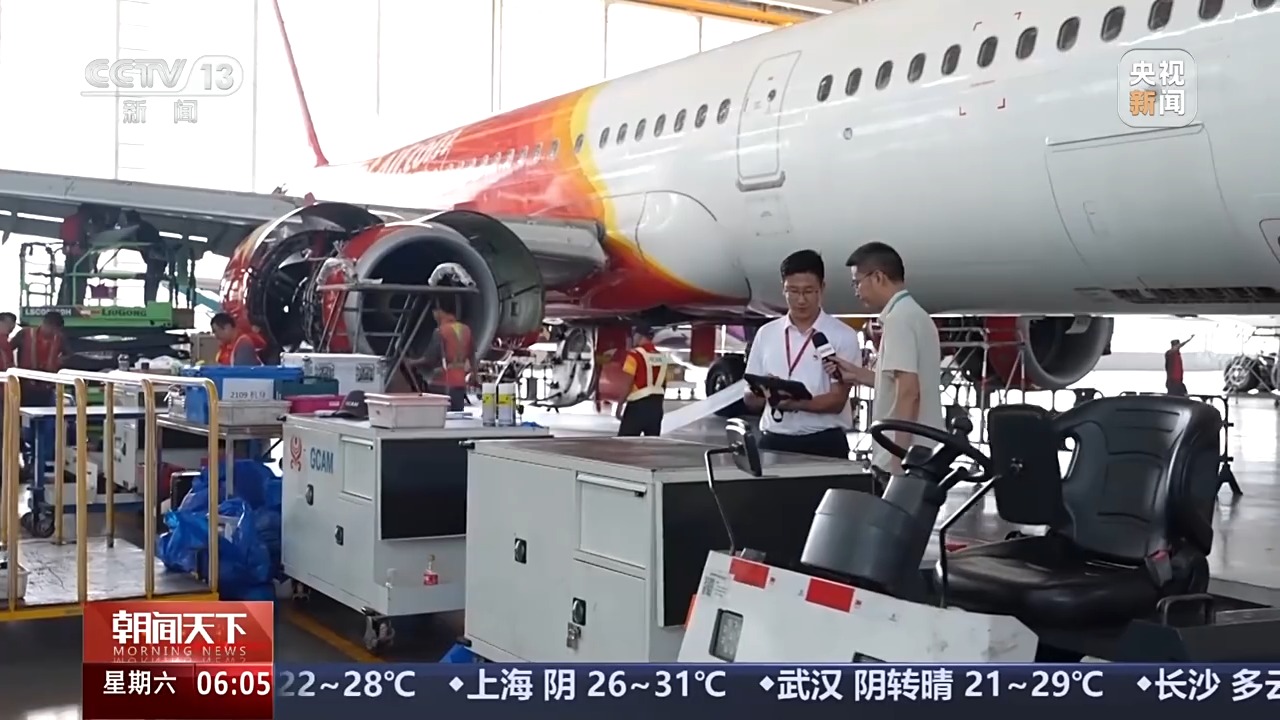 一站式飛機(jī)維修產(chǎn)業(yè)基地副總監(jiān) 楊文博:我們現(xiàn)在看到的這架是來自泰國(guó)的,這里兩架越南的,機(jī)坪上也有等待進(jìn)機(jī)庫(kù)進(jìn)行維修的一架境外飛機(jī)。我們今年上半年的境外維修飛機(jī)的數(shù)量已經(jīng)接近于去年一年的量了?,F(xiàn)在每條線位都已經(jīng)是滿的了,一直要持續(xù)到2026年11月底。