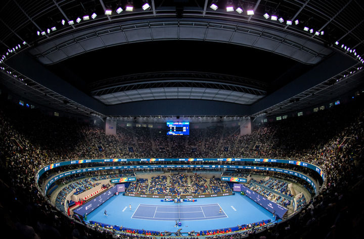 10月1日,中國網(wǎng)球公開賽期間,球迷在國家網(wǎng)球中心內的大屏前觀看比賽。新華社記者 杜昕怡 攝