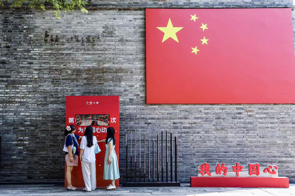 10月1日,在浙江嘉興市南湖區(qū)建設街道子城城墻邊,市民參加我為祖國心動打卡活動。新華社記者 徐昱 攝