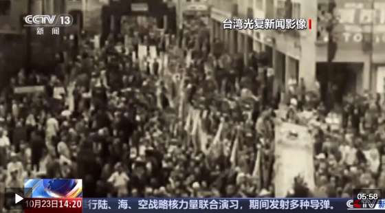 “10月25號,日本代表在臺北中山堂簽字投降。淪陷五十年的臺灣,重回祖國懷抱。萬千的臺灣同胞,再見天日,重獲自由,在街上熱烈慶祝?!?/p>