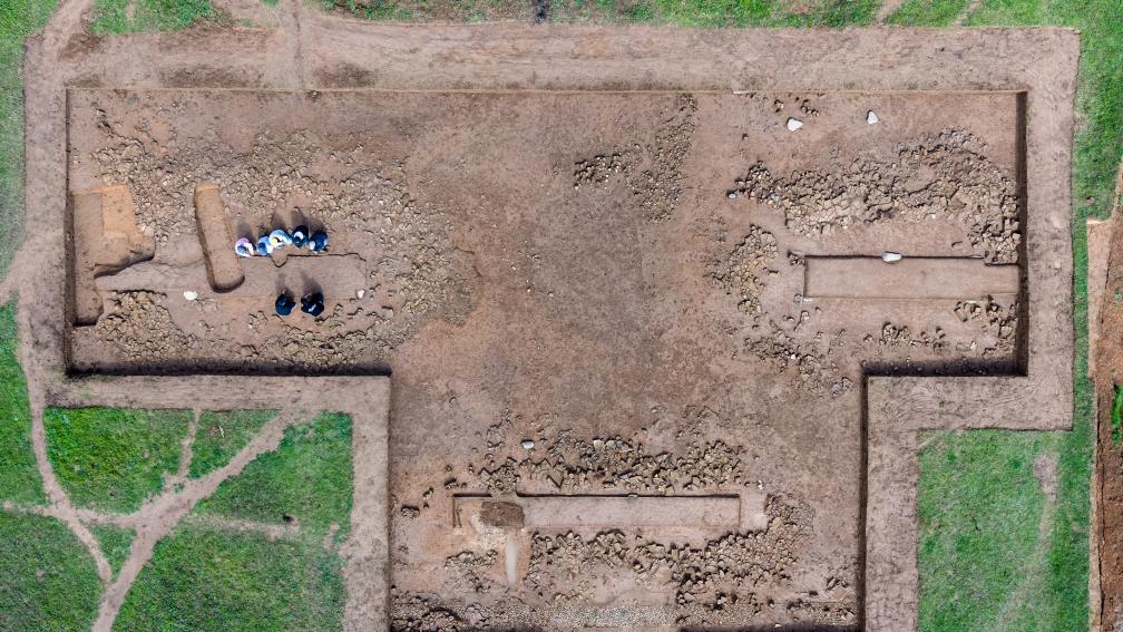 這是10月15日拍攝的甘肅省隴南市禮縣四角坪遺址考古發(fā)掘現(xiàn)場(無人機(jī)照片)。新華社記者 陳斌 攝