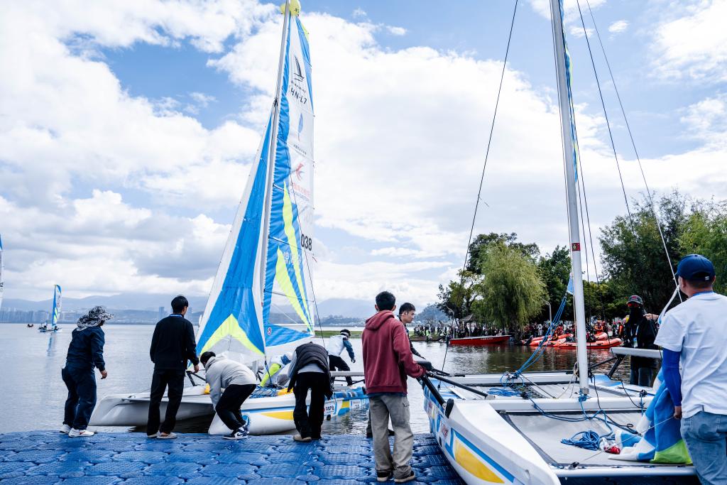10月25日,中國萬水千帆賽大理站在云南省大理白族自治州開賽,圖為參賽船只從出發(fā)點下水。新華社記者 胡超 攝