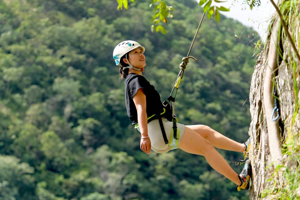 10月4日,游客在云南大理南澗彝族自治縣公郎鎮(zhèn)猛龍渡體驗“攀巖”運動。新華社發(fā)(適志宏 攝)