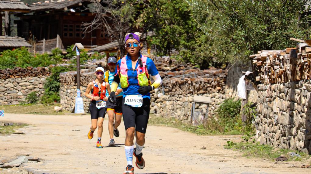 9月27日,首屆巴松措山地越野跑在西藏林芝市工布江達縣巴松措風景區(qū)舉行,圖為參賽選手穿過古村落錯高村。新華社記者 格桑朗杰 攝