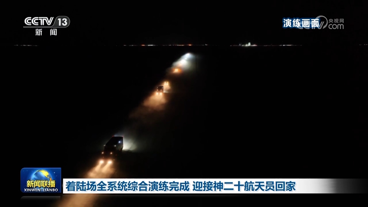 央視網(wǎng)消息(新聞聯(lián)播):神舟二十號乘組將于近日擇機返回東風著陸場。11月2日晚,著陸場區(qū)組織所有搜救力量,進行了最后一次全系統(tǒng)綜合演練。