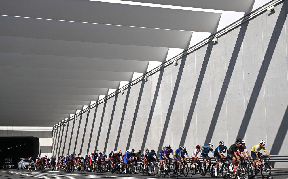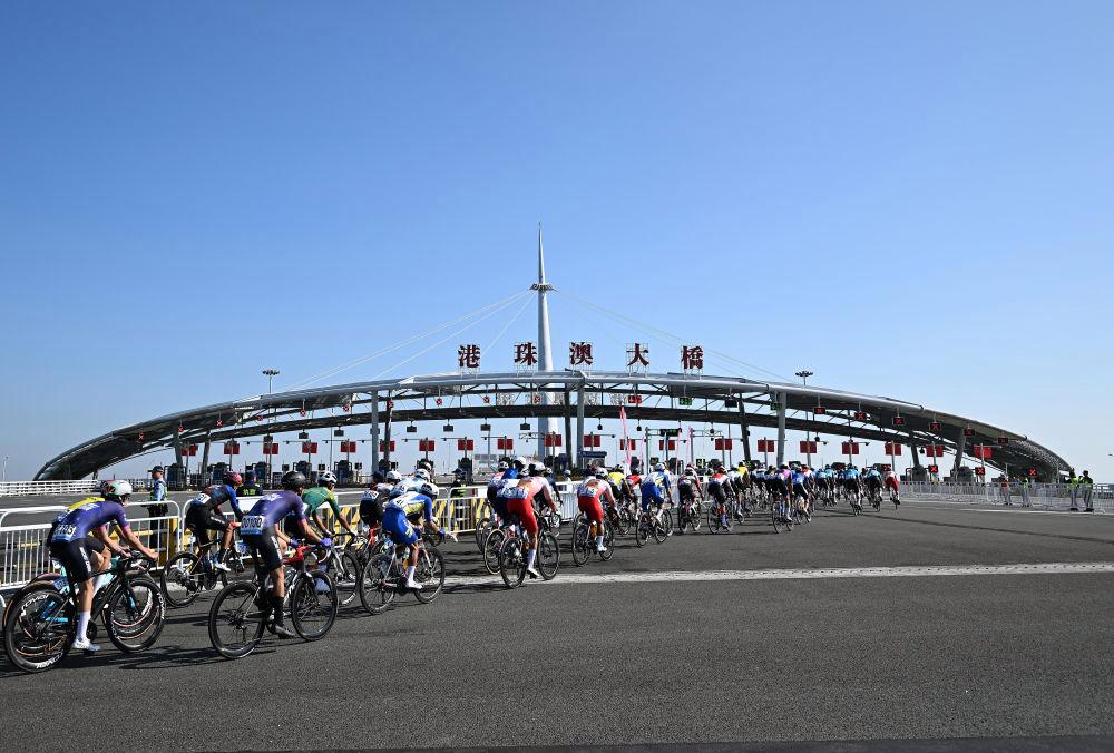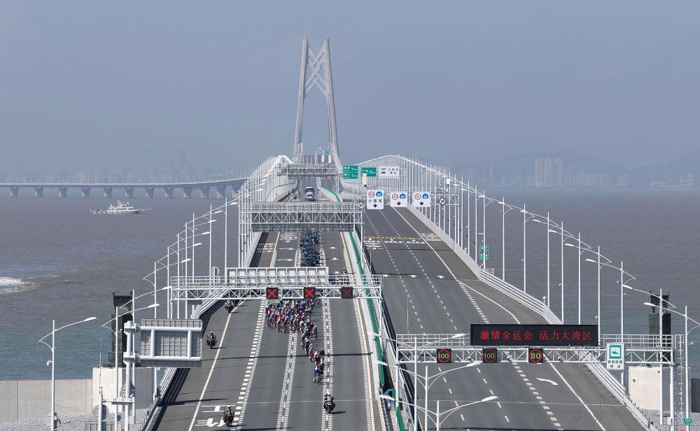 11月8日,在第十五屆全國運(yùn)動會公路自行車男子個人賽決賽中,參賽選手在港珠澳大橋騎行。新華社記者梁旭 攝