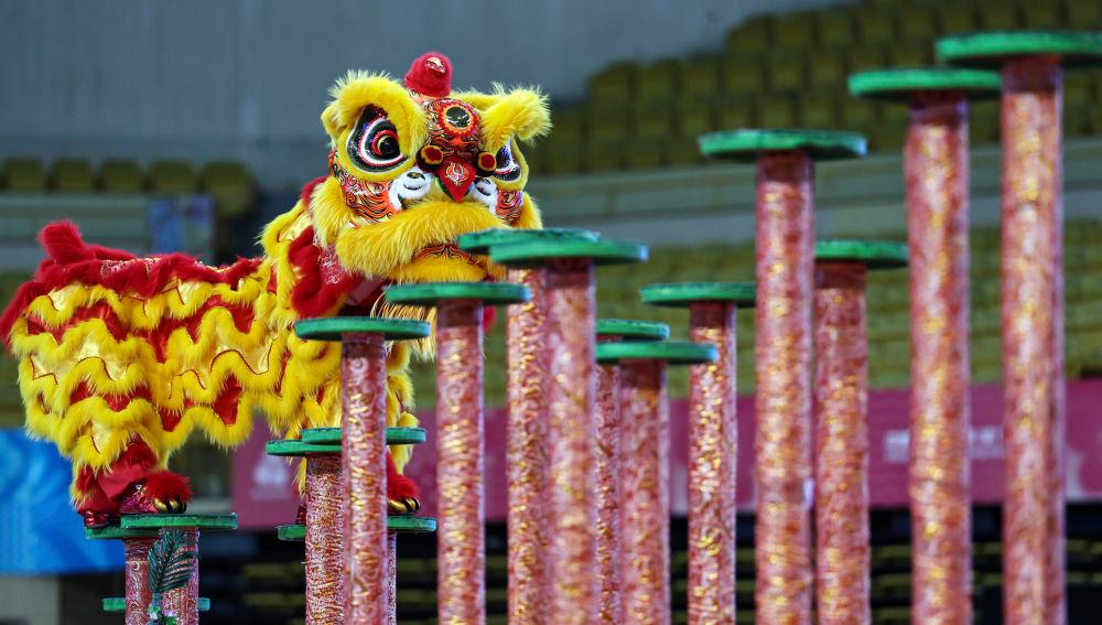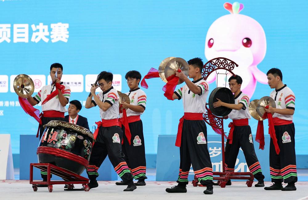 11月11日,粵港澳聯(lián)隊在第十五屆全國運(yùn)動會群眾展演舞龍舞獅南獅自選項目決賽比賽中。最終,粵港澳聯(lián)隊獲得一等獎。 新華社記者 王鵬攝