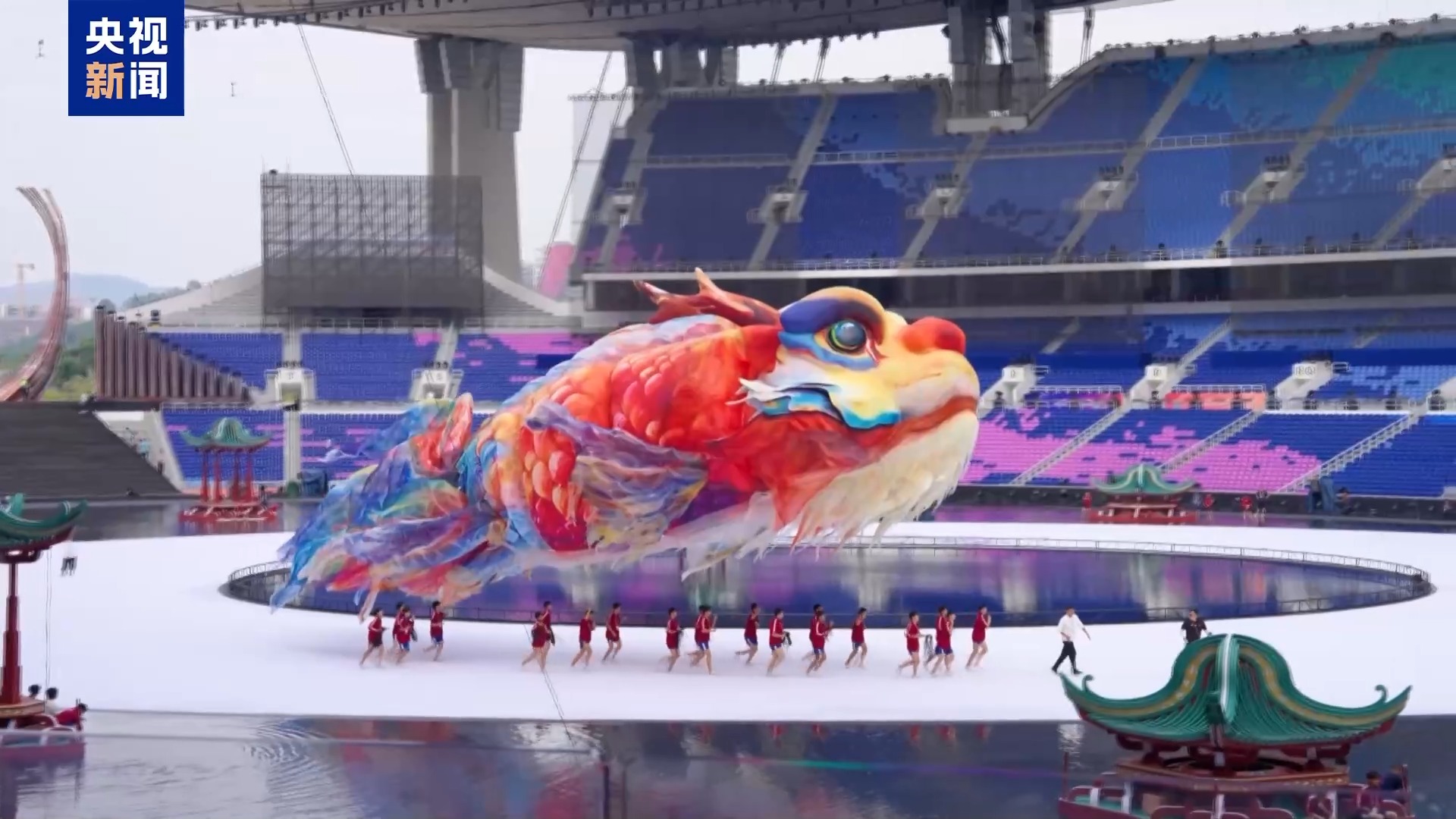 十五運(yùn)會開幕式美術(shù)總設(shè)計(jì) 巨型鰲魚原創(chuàng)設(shè)計(jì)者 尚天寶:這只鰲魚的造型和傳統(tǒng)意義上的鰲魚有些許不同,保留了龍頭魚身,但是尾巴部分我們做了特殊的處理,把這種鳳尾鯉魚的大尾巴嫁接了進(jìn)來,魚鰭、魚身參考了金龍魚的魚身,讓它更好看,色彩上更嶺南,發(fā)揮了嶺南的濃郁用色的極致。