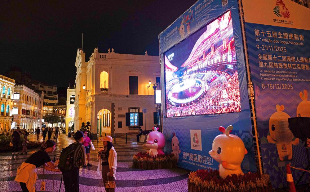 11月9日,群眾在澳門議事亭前地觀看第十五屆全國(guó)運(yùn)動(dòng)會(huì)開幕式直播。