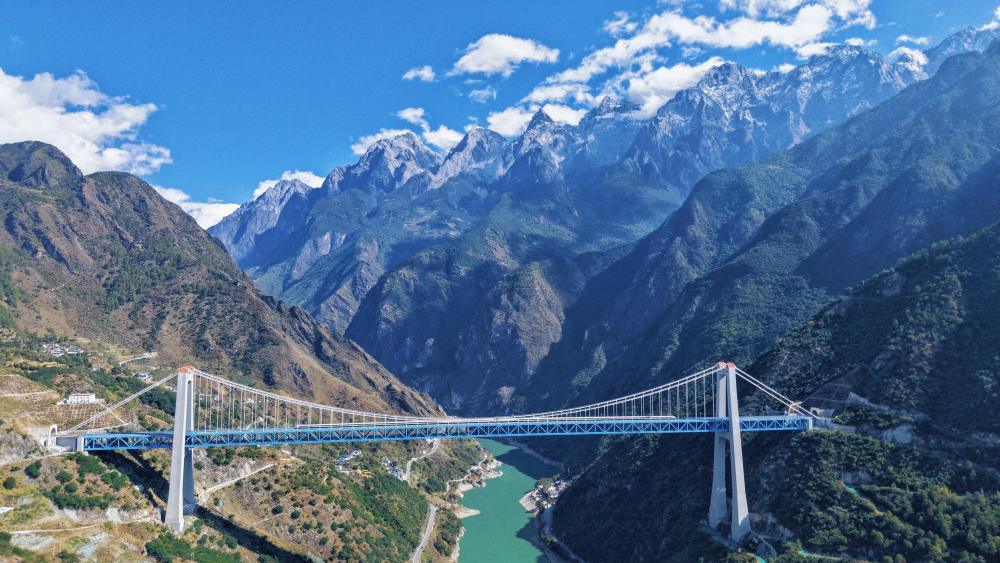 這是11月21日拍攝的虎跳峽金沙江鐵路大橋。大橋全長882.5米,起于玉龍雪山隧道出口,止于哈巴雪山隧道進(jìn)口,是麗香鐵路的重點控制性工程(無人機(jī)照片)。