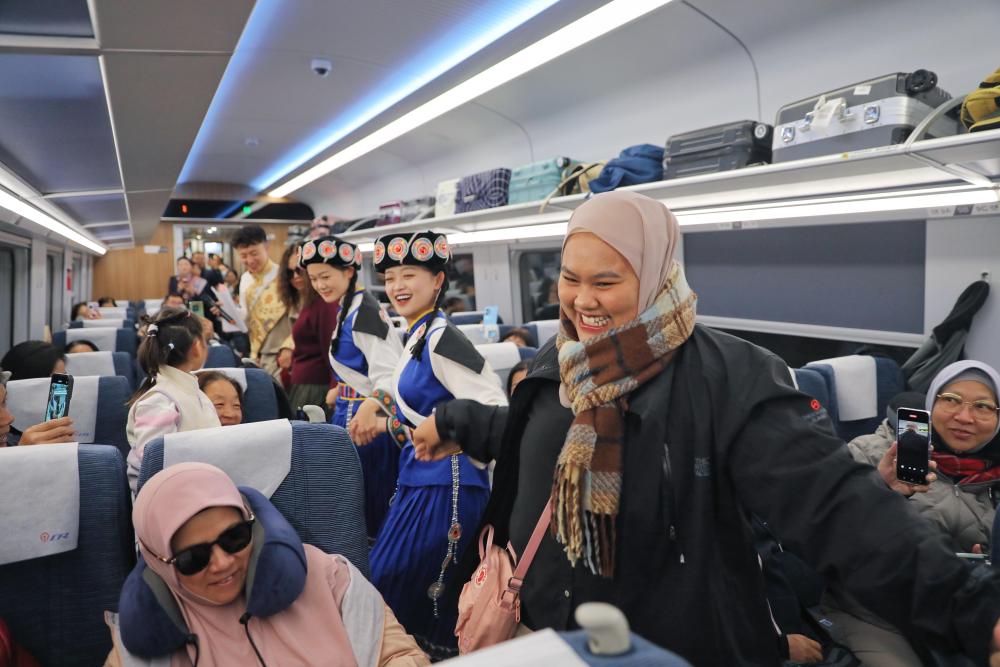 11月22日,在麗香鐵路動車組列車上,東南亞游客與身著民族服飾的乘務(wù)員一同跳舞。