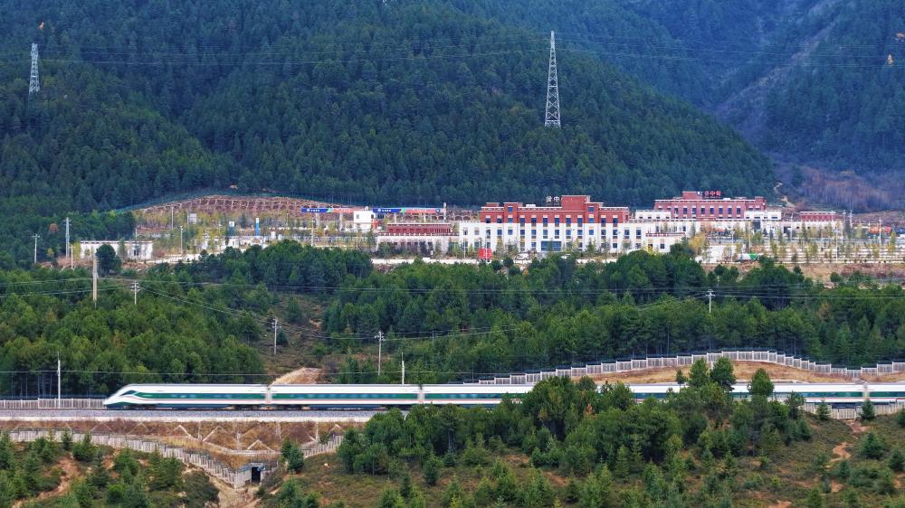 11月21日,一列動車組列車駛過云南迪慶藏族自治州小中甸站(無人機(jī)照片)。
