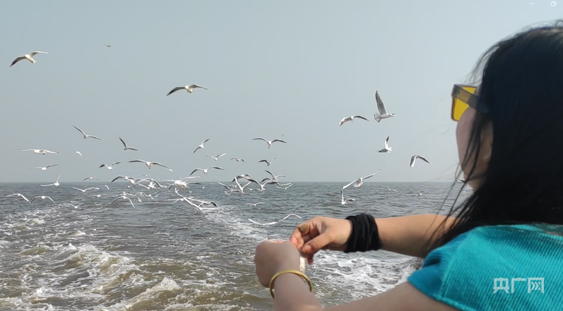 游客在漁船上喂海鷗(央廣網(wǎng)見習(xí)記者 安適存 攝)