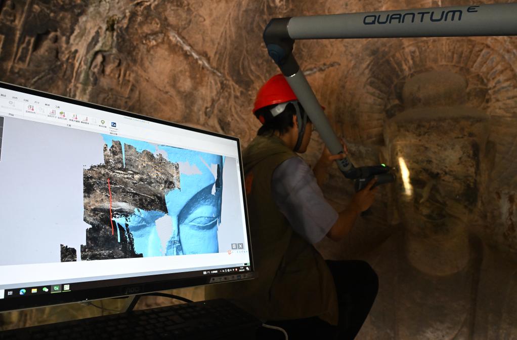 2025年4月9日,武漢大學(xué)文化遺產(chǎn)智能計算實驗室團(tuán)隊成員在魏字洞使用關(guān)節(jié)臂掃描儀對佛像進(jìn)行數(shù)字化掃描。新華社記者 李嘉南 攝
