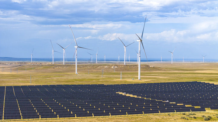 在新疆阿勒泰地區(qū)吉木乃縣拍攝的50萬(wàn)千瓦時(shí)風(fēng)電項(xiàng)目配套輸電線(xiàn)路建設(shè)現(xiàn)場(chǎng)(2025年7月1日攝,無(wú)人機(jī)照片)。新華社發(fā)(努爾別克·努爾曼 攝)