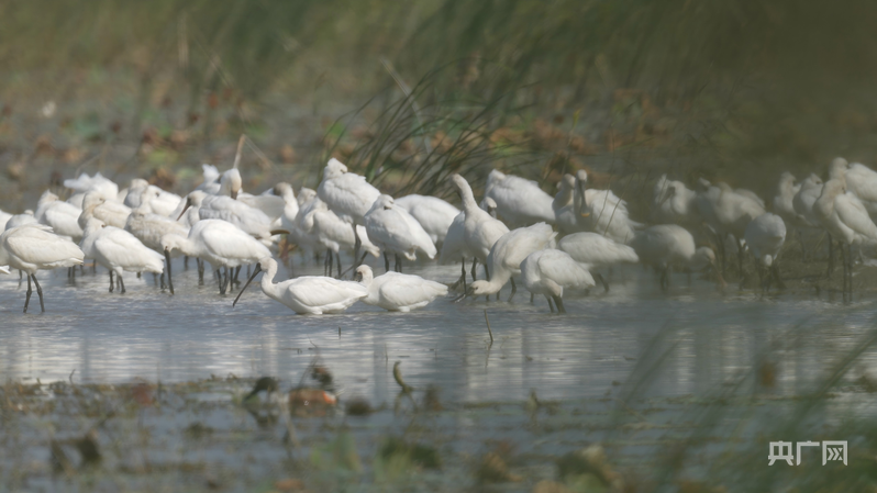 成群的黑臉琵鷺在淺灘上覓食、棲息(央廣網(wǎng)發(fā) 陳嚴(yán)雪 攝)